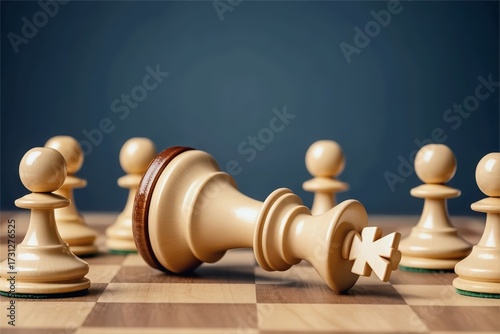 fallen king chess piece surrounded by pawns. Political coup and betray
