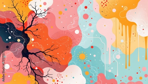 An abstract art piece with vibrant colors and patterns. It is composed of various shapes and forms that include swirls, splatters, and a large tree like structure with a missing section in the center