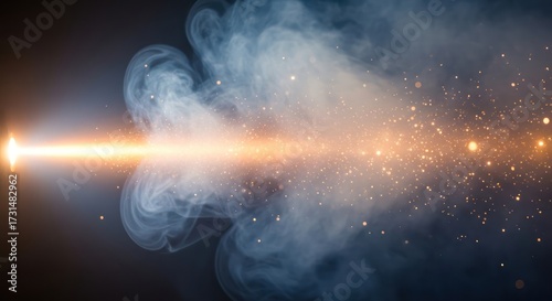 Dynamic light streak amidst swirling smoke and golden glitter conveying energy and mystique