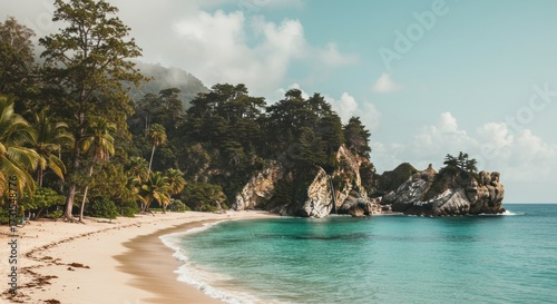 Scenic view of a tropical beach with white sand, turquoise water, lush green vegetation, and rocky cliffs under a cloudy sky.