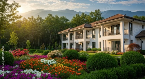 Luxurious modern estate with vibrant flower garden and majestic mountain backdrop