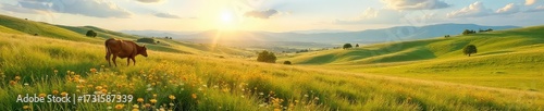 Vast, sun-drenched ranch meadows stretch to the horizon, wildflowers blooming amidst rolling hills and grazing cattle A peaceful, idyllic scene of rural life , rural, pasture