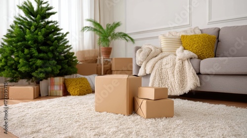 Cardboard boxes in a living room with a christmas tree, symbolizing moving or holiday delivery.