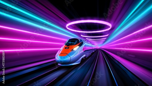 Futuristic high-speed bullet train racing through neon tunnel, showcasing modern technology, electric railway system, dynamic motion, urban transit innovation, glowing lights, rapid passenger travel.