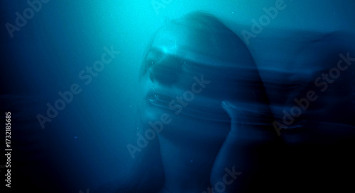 Dreamy moody cinematic portrait of a brunette woman with blue-aqua glow and long exposure