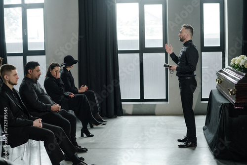 Caucasian man standing and speaking to group of men and women sitting in row at funeral ceremony near closed casket in modern room