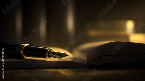 Open leather-bound guestbook on hotel counter with fountain pen, warm ambient light highlighting paper texture and elegant editorial style