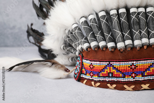 Traditional warbonnet (Native American chief headdress) on light grey table, closeup