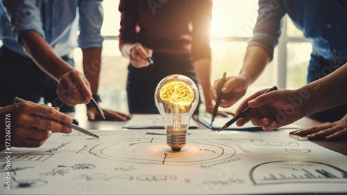 Brainstorming session with light bulb and brain creative idea generation teamwork