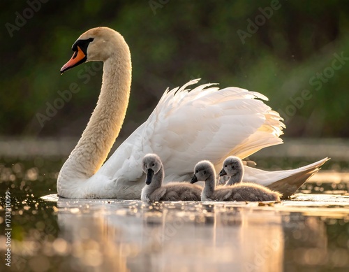 Swan with cygnets in morning light