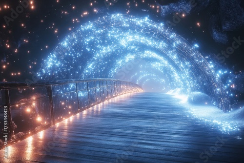 Illuminated bridge and tunnel with glowing lights.