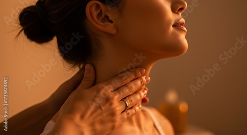 Gentle hand touches womans neck in soft light for relaxation and wellness