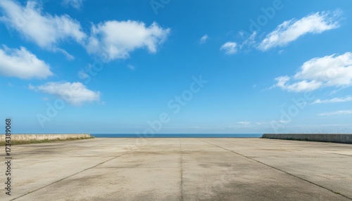 A wide, flat expanse of concrete stretches towards a calm ocean under a mostly clear sky with a few fluffy white clouds.