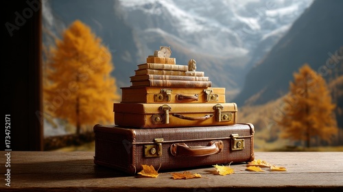 Vintage Suitcases Stacked with Books, Clock, and Sculpture on Wooden Table