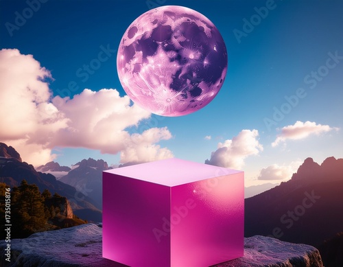 Abstrakcyjna ilustracja przedstawiająca sześcian z umieszczonym nad nim księżycem