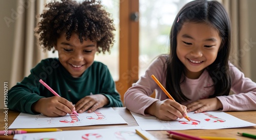 明るい自然光の中笑顔でカラフルな絵を描く多民族の子供達楽しそうに集中する室内活動. AI Generated