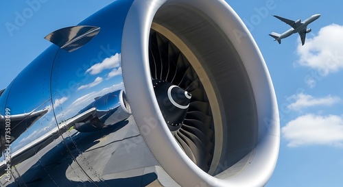 Closeup of Modern Jet Engine with Airplane Flying Above Blue Sky.