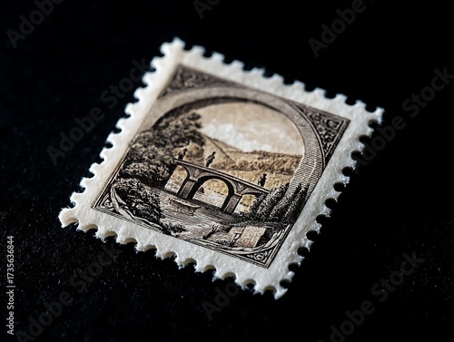 Close-up of antique postage stamp with arched bridge and countryside engraving, detailed collectible philatelic artwork