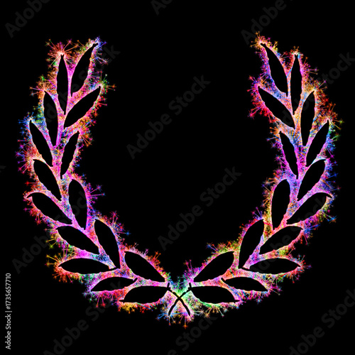 Kolorowe zimne ognie i fajerwerki układające się w kształt wieńca laurowego symbolu zwycięstwa.