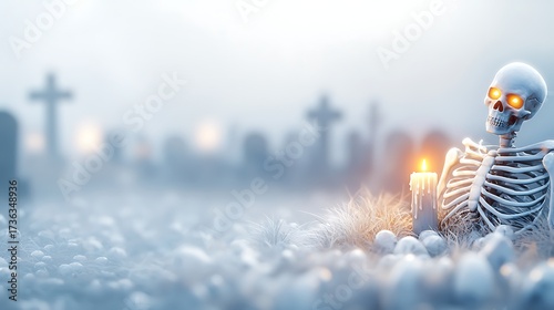 Medium format 50mm focusing on skeleton detail with glowing candle cross and graveyard mist