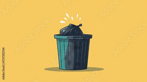 6.A simple but bold isolated icon of a plastic waste container with a black garbage bag peeking out from under the lid. Wisps of unpleasant odor are illustrated rising from the decomposing trash