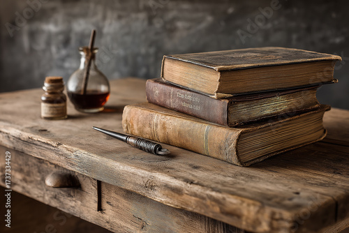 Rustic Wooden Desk with Old Textbooks and Ink Pen, Vintage