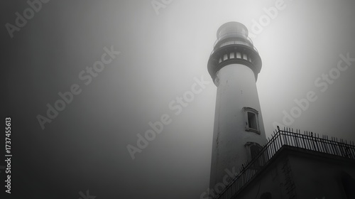 The image depicts a tall, white lighthouse enveloped in thick, swirling fog, creating a mysterious and atmospheric scene.
