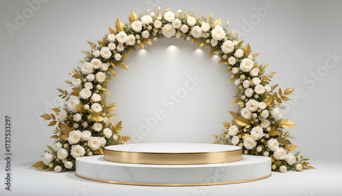Elegant floral arch and white podium for presentations or ceremonies.