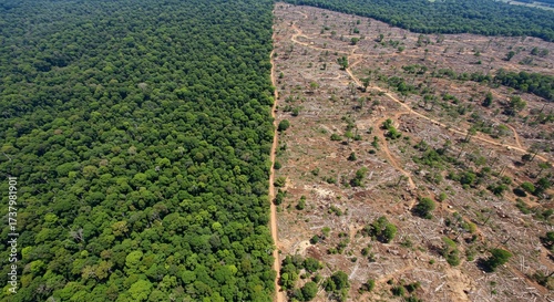 Aerial view of deforestation's severe environmental impact, showing green forest meeting barren land, symbolizing habitat loss and ecological destruction
