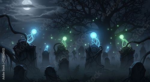 Photo of eerie graveyard at night under a full moon, with glowing blue and green spectral lights emanating from ancient tombstones and gnarled trees
