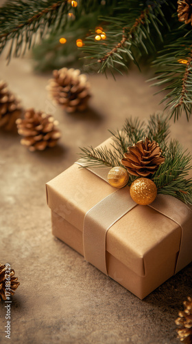 #1738367329A wrapped gift box, adorned with natural elements. Gift box is light beige kraft paper, tied with twine. Pine sprigs and pinecones decorate the top