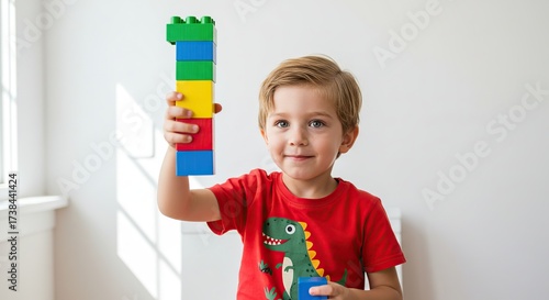 Happy Young Boy Holding Colorful Building Blocks Learning Stacking Toy Fun Play Isolated on White Background
