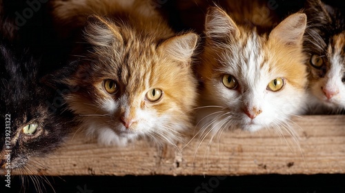 Barndwelling feline quartet, enigmatic gaze unfolds, whiskered camaraderie, clandestine secrets, resonance with Hug Your Cat Day, cat spirit rituals