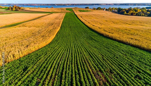Aerial vista reveals contrasting agricultural fields, leading to a distant body of water and under a sky with trees