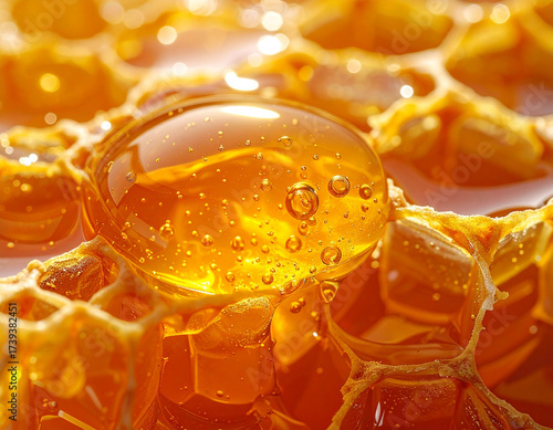 Macro detail of honeycomb cells oozing golden honey, sticky glossy surface