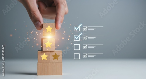 Customer feedback and rating system with star icons and checklist
