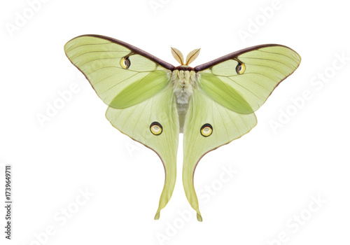 Isolated Luna moth close-up with wings spread, a beautiful pale green insect, wildlife macro
