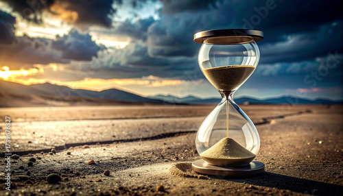 Image of Dramatic hourglass in the middle of a barren, wet landscape under a stormy, foreboding sky, symbolizing fleeting time