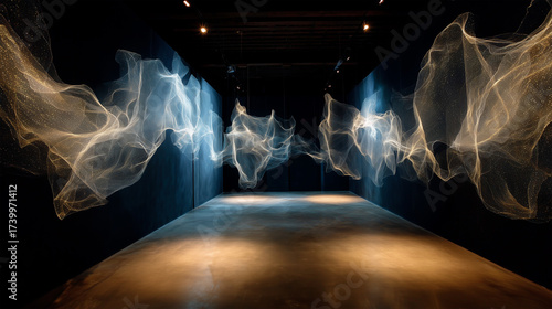 Network of light threads creates dynamic patterns in a dark navy room filled with smoky ambiance