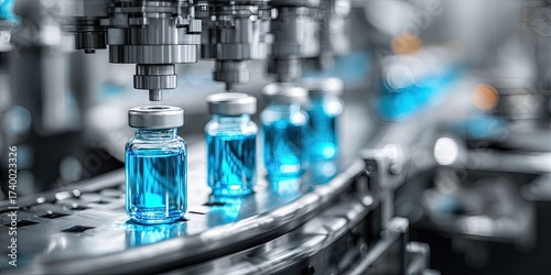Automated machine filling vials with blue liquid on a production line, in a pharmaceutical process