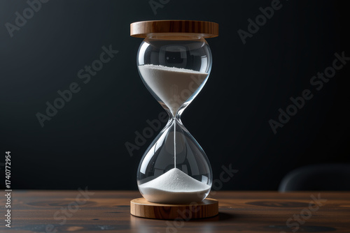 Hourglass time concept minimalist sand glass wooden base dark background elegant space