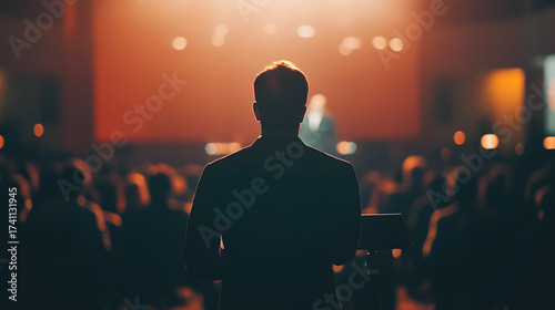 A presenter delivers a lecture on stage at a conference, with the background slightly blurred, focusing on the corporate audience.