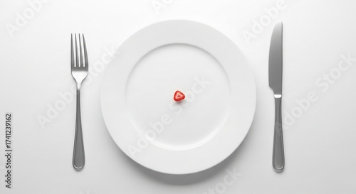 A single tiny strawberry sits alone on a large white plate with a fork and knife ready for a very small meal