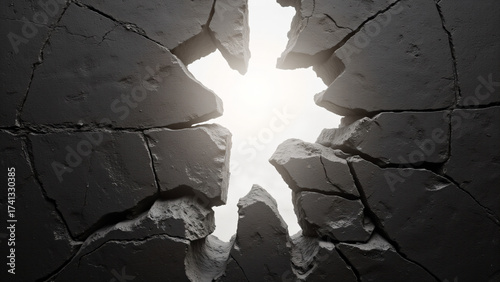 Sonnenlicht scheint durch eine dramatisch zerbrochene Stein- oder Betonmauer