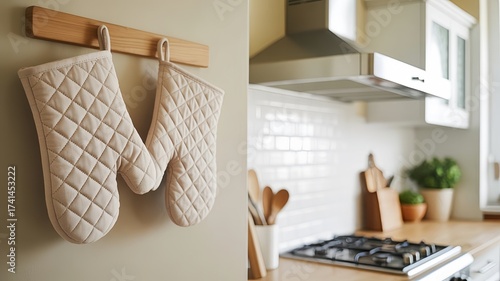 Kitchen with hanging oven mitts and modern appliances in soft colors