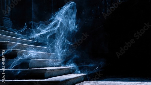 A spooky Halloween concept of a ghostly figure made of translucent smoke floating up a dark abandoned staircase at night