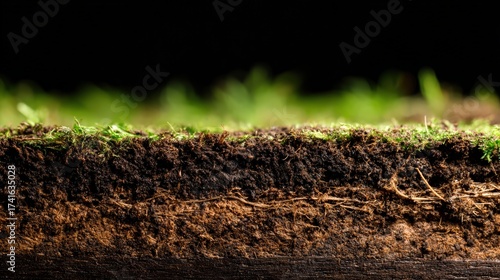 Detailed cross section of soil layers showcasing rich organic material and grass roots