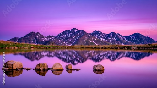 Scenic Mountain Reflection in Calm Lake Water at Dusk with Purple Sky and Scattered Snow