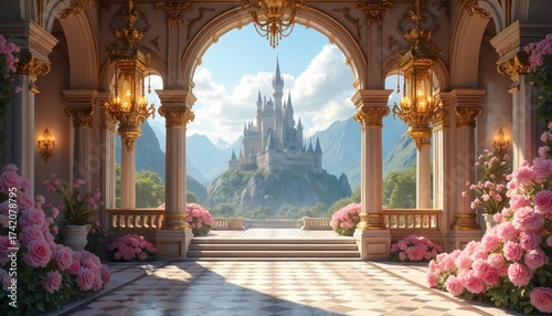 Ornate palace balcony overlooks majestic castle on mountain peak. Pink roses frame opulent interior with grand columns. Sunlight shines on fantasy landscape with blue sky.