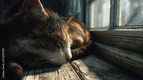 Adorable tabby cat napping peacefully in warm sunlight by rustic window sill, radiating comfort and serenity, perfect for pet lovers and cozy scenes